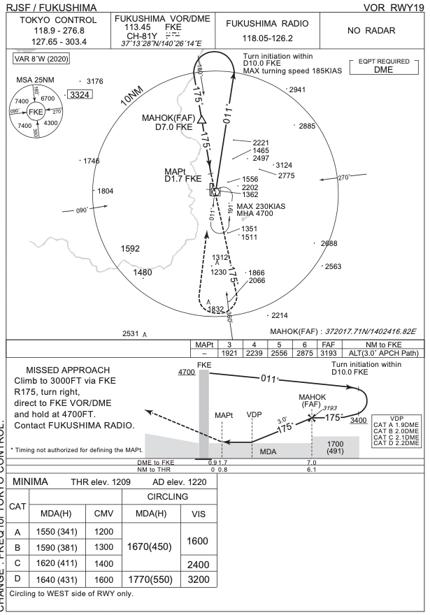 福島空港RWY19でVOR RWY19を使用している時で離陸の代替飛行場を選定しない場合は、視程が1200m以上かつ雲高が1550ft以上である必要があります。