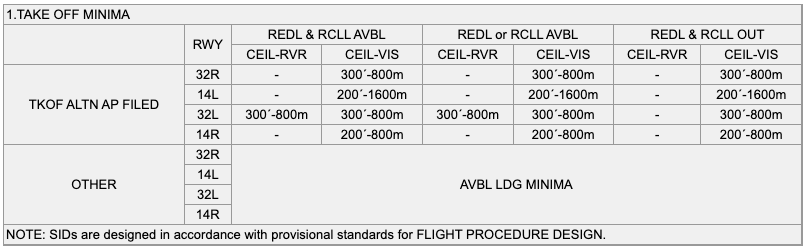これは伊丹空港のtakeoff minimaです。下の部分のNOTEにSIDs are designed in accordance with provisional standards for FLIGHT PROCEDURE DESIGN.